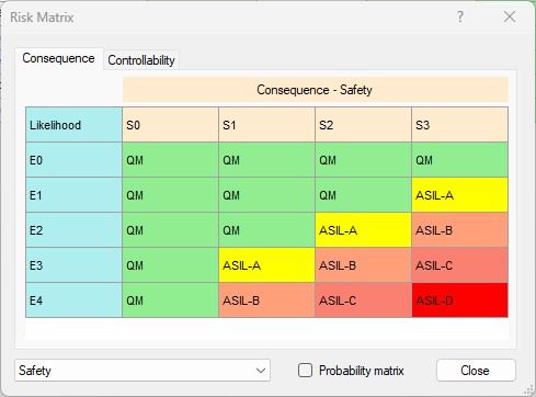 Risikomatrix zur sicherheitsbezogenen Bewertung von Risiken nach ASIL, basierend auf Eintrittswahrscheinlichkeit und Konsequenz