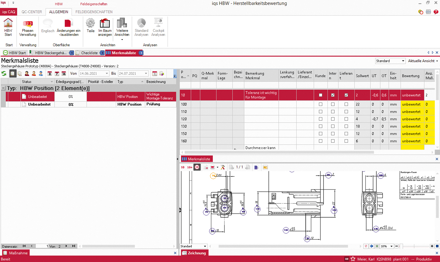 Softwarescreen Merkmalsliste Herstellbarkeitsbewertung inkl. 2D-Zeichnung