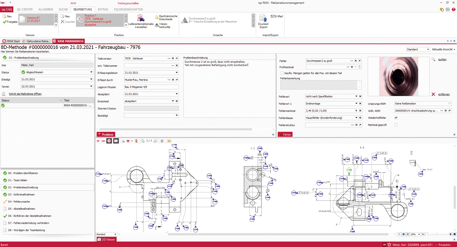 Softwarescreen Problembeschreibung einer Reklamation mit 2D-Zeichnung